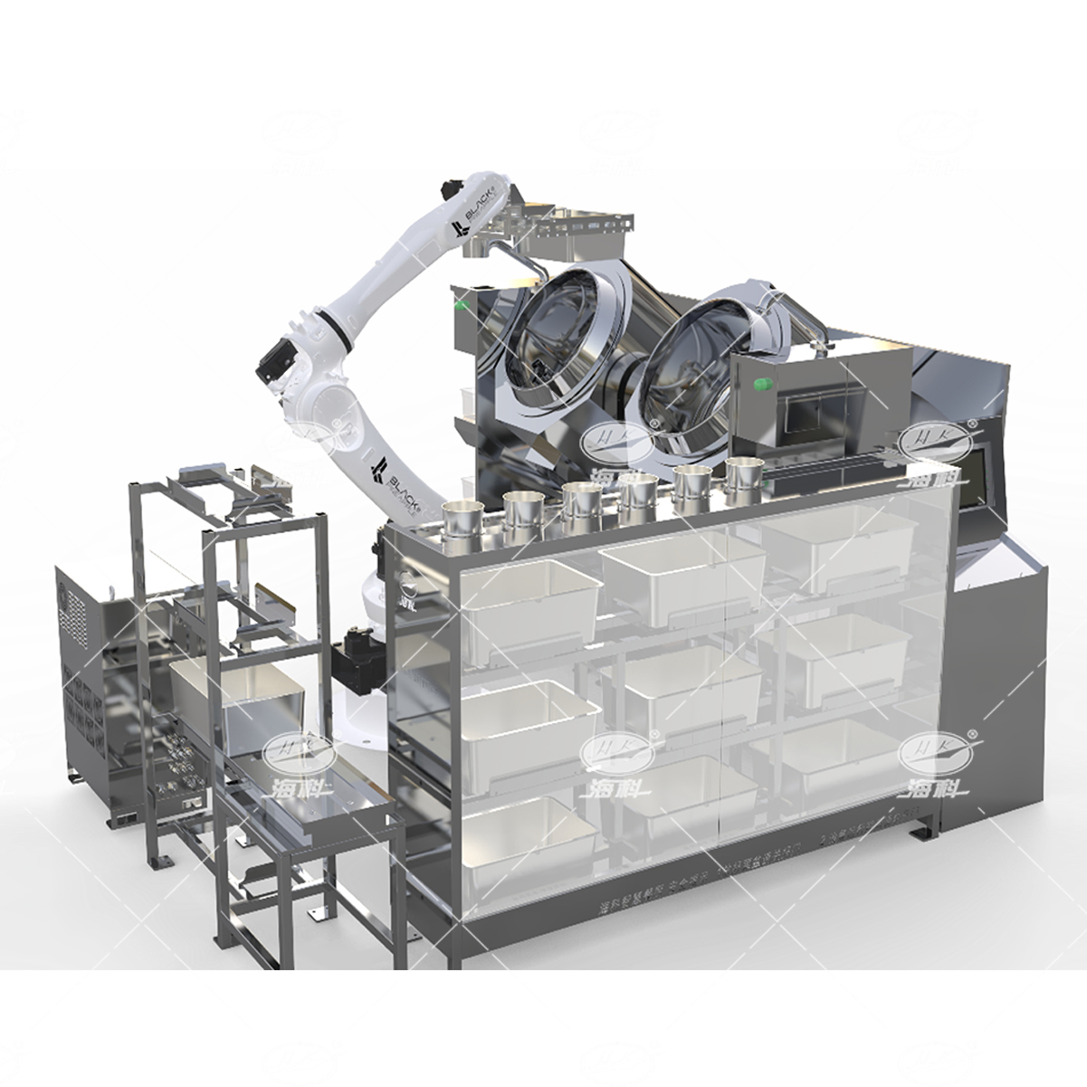 可用于集体用餐的食堂(机关、院校、工厂、中央厨房配餐中心等大型食堂)等场景量身打造的烹饪系统,主要由空盆/成品智能库、净菜/调理肉/调料智能库、工控上位机SaaS软件系统、数字化智能炒菜锅以及工业级机器人组成,工控上位机对接云端,接收并统一向各模块发出指令。